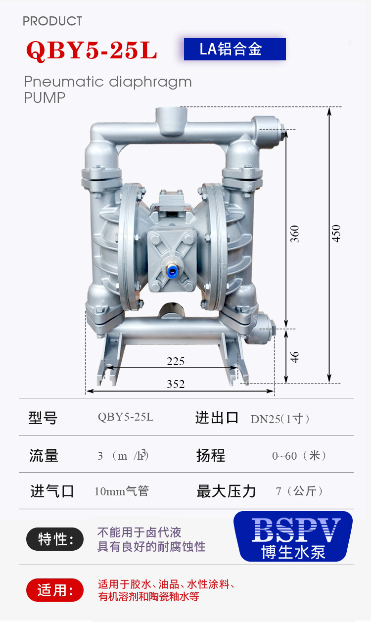 上海博生水泵QBY5-40L型鋁合金氣動(dòng)隔膜泵,油墨泵,耐腐蝕氣動(dòng)隔膜泵,污水排污氣動(dòng)隔膜泵系列第五代氣動(dòng)隔膜泵是一種新型輸送機(jī)械,采用壓縮空氣為動(dòng)力源,對(duì)于各種腐蝕性液體,帶顆粒的液體,高粘度、易揮發(fā)、易燃、劇毒的液體,均能予以抽光吸盡。其性能參數(shù)與聯(lián)邦德國的WLLDENPVMPS、美國的MARlOWPUMPS相近。